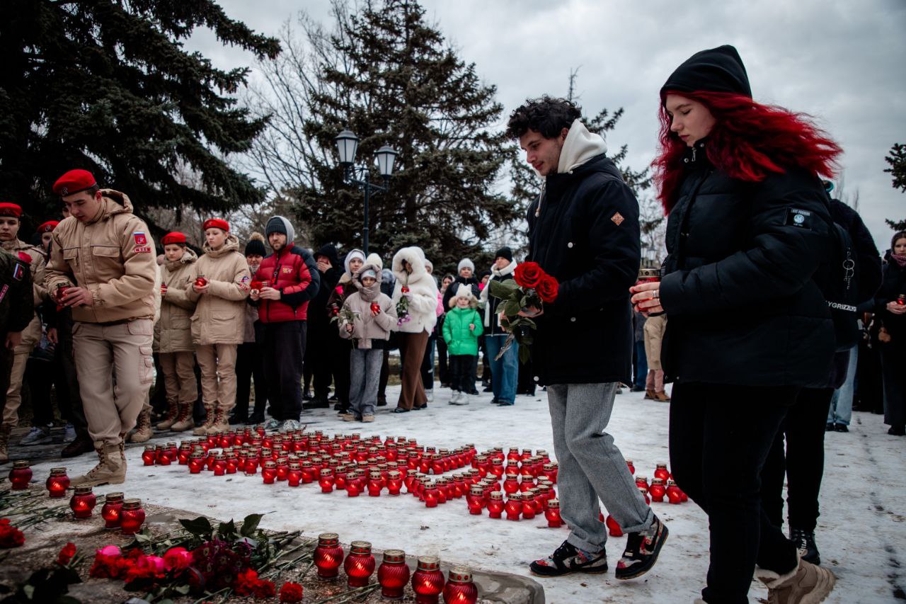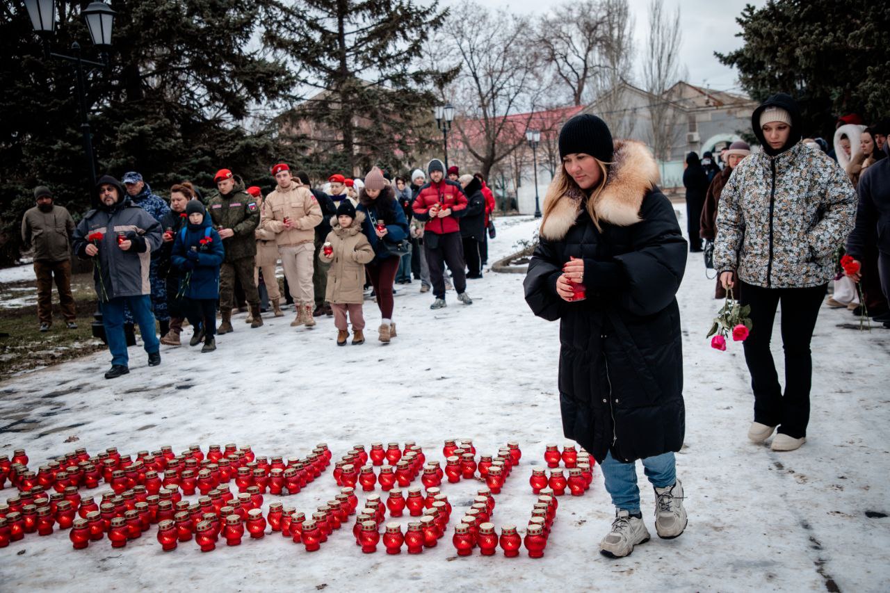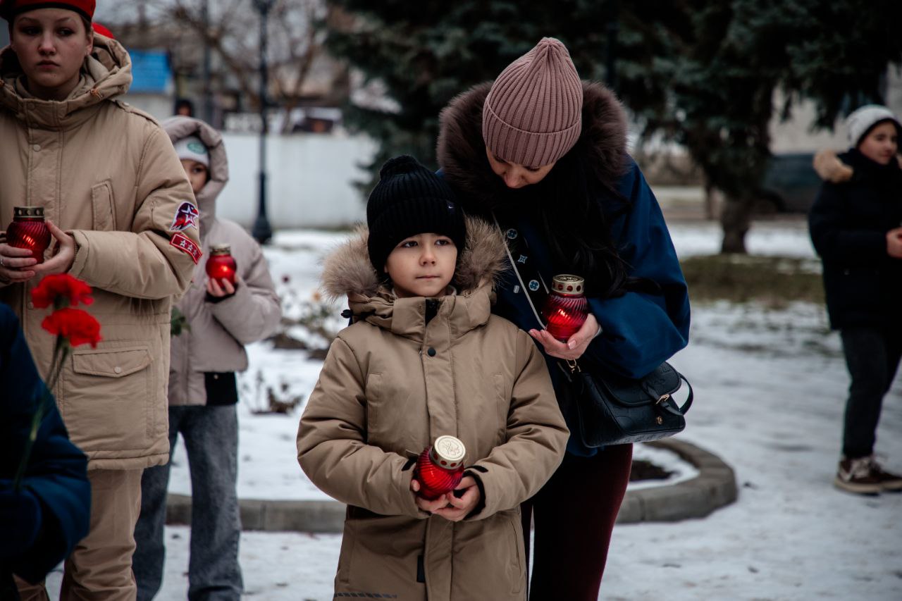 У памятника «Скорбящей матери» в Геническе собрались жители, активисты и юнармейцы. В дни траура они возложили цветы и игрушки, зажгли лампады и почтили минутой молчания мирных жителей, погибших в результате удара беспилотников по селу Хорлы.